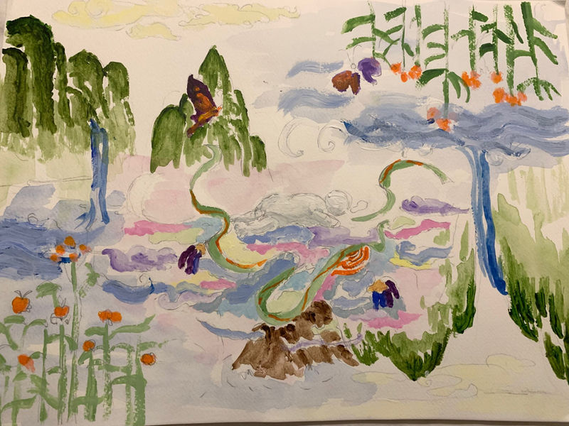 The artwork is a visual reinterpretation of 무릉도원 (mureungdowon) – a concept of Utopia from Asian culture. The five-panel painting – inspired by folding screens – emulates the idea of love as an emotional isolation. Korean painting techniques were maintained while implementing elements of Western contemporary art. The work asks the questions: Have you fallen in love, and what is love to you?